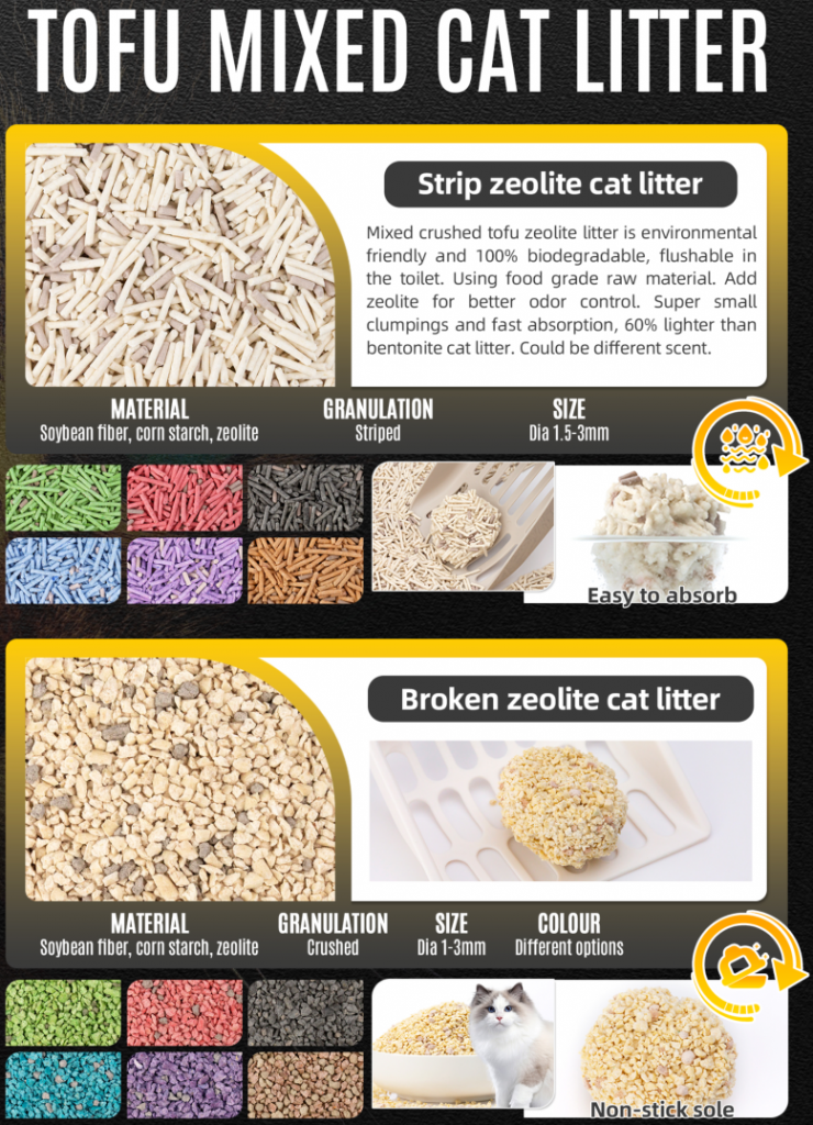 Upgrade to Mixed TOFU Cat Litter, the eco-friendly blend of natural pea/tofu fiber and super-absorbent sodium bentonite that creates harder clumps, 350 % absorption, and 99.5 % dust-free performance. This non-toxic, biodegradable kitty litter is flushable in small amounts, lightweight, and gentle on sensitive paws, making it the best tofu litter for kittens, post-surgery cats, and allergy-prone households. Available in 2 mm & 3 mm pellet diameters, custom scents (green tea, charcoal, peach, lavender), and OEM 2.5–20 kg bags, our low-tracking, fast-clumping formula neutralizes ammonia odors for up to 14 days. Enjoy factory-direct pricing, FBA-ready packaging, and fast shipping from Qingdao/Shanghai—ideal for Amazon sellers, pet boutiques, shelters, and eco-conscious cat parents seeking sustainable, septic-safe, long-lasting cat sand. Choose Mixed TOFU + Bentonite for a cleaner box, fresher home, and greener planet—scoop, flush, relax.